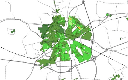 Ook op de leefbaarheidkaart maakt Apeldoorn zijn reputatie van groene stad waar: bijna de hele stad is groen geschakeerd, variërend van heel lichtgroen (‘matig positief’) tot donkergroen (‘uiterst positief’). Van de 25 grote gemeentes die voor dit verhaal zijn vergeleken is alleen de Haarlemmermeer nog groener, maar dat is een uitwaaierende verzameling dorpskernen, en geen min of meer traditioneel opgebouwde stad als Apeldoorn.