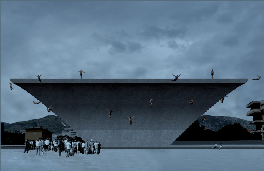In haar boek stelt ze de reconstructie van de Oude Brug van Mostar, die in de oorlog was opgeblazen, aan de kaak: een perfecte remake ontkent de oorlog en de gevolgen ervan. In plaats van de vorm stelt ze het sociale gebruik van de vroegere brug centraal: jonge inwoners van alle gezindten doken van de vierentwintig meter hoge brug om hun mannelijkheid te bewijzen. Zo komt ze tot een monumentale tribune annex duikplank.