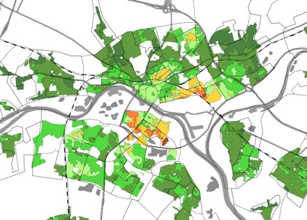 Een soortgelijk verschuiving naar de randen van de stad is ook zichtbaar in de nieuwbouwstad op de linkeroever van de Rijn. In de erkende probleemgebieden – Malburgen-West, Zeesingel en omgeving, Immerloo – werd bijna over de hele linie vooruitgang geboekt. Maar daartegenover stond dat verder naar het zuiden, onder de Pleyroute, tussen 1998 en 2008 overal clusters opdoken met een teruglopende leefbaarheid. Een helder ruimtelijk patroon valt er niet in te ontdekken in de 21 kleine plekken, waarvan 18 een ‘beperkt negatieve ontwikkeling’ tonen en 3 zelfs een ‘grote negatieve ontwikkeling’. Alleen rond winkelcentrum Kronenbrug is sprake van een duidelijke combinatie van een verslechtering van veiligheid, bevolkingssamenstelling, voorzieningenniveau en sociale samenhang. Omdat de verbetering van de publieke ruimte dit niet goed kon maken, leidde dit tot een vergroting van de clusters met de score ‘matig’ en het ontstaan van een ‘negatief’ cluster rond de Schepen ten Havenstraat. Winst was wel dat het kleine ‘zeer negatieve’ gebiedje rond de Schepen van Ommerenstraat verbeterde tot ‘matig’.