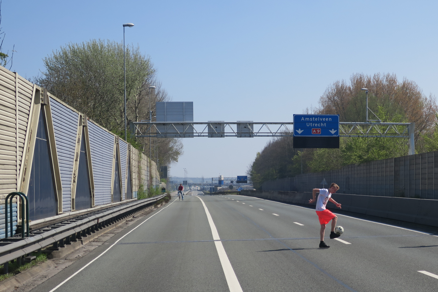 Meer dan vijftig jaar raasde het snelwegverkeer dwars door Badhoevedorp, maar sinds vrijdagavond 9 april kun je er een speld horen vallen: de nieuwe A9 leidt het verkeer met een boog om het dorp. Aanvankelijk stonden de nooddeuren van de geluidsschermen open en speelden de dorpelingen onbekommerd autoloze zondag op de oude A9, tot de aannemer de deuren dichtlaste. Maar als je, zoals het jongetje en de fotograaf, een beetje moeite doet, kun je nog zo de snelweg op kruipen.