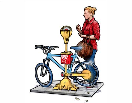 Wat zou dat eigenlijk gaan kosten, zo’n fietsparkeerplek? Het tarief om je auto op straat te parkeren biedt aangrijpingspunten, in het Amsterdamse centrum is dat vijf euro per uur. Op een autoplek kunnen minimaal acht fietsen staan, dan kom je voor een fiets op 63 cent per uur. Ondenkbaar? Toen vijftig jaar geleden de parkeermeter voor auto’s werd ingevoerd – tarief een dubbeltje per half uur – verstomde het protest al snel.