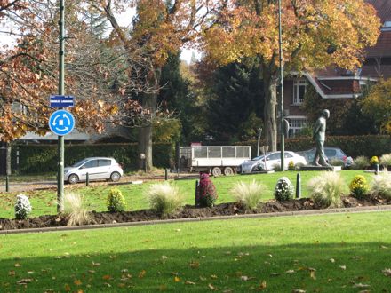 Nog verder inzoomen dan maar, en dan ontdek je dat aan de noordkant van de Ringlaan nog een heel klein cirkeltje zit, meer dan honderd keer zo klein in oppervlak. En aan de rand van dit rotonde-tje staat het beeld dat kunstenares Elisabeth Barmarin van Boudewijn maakte. Licht voorovergebogen, de handen op de rug, lijkt hij van zijn plek weg te willen lopen, naar de grote cirkel.