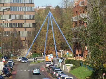 Op de rotonde bij metrostation Demey staat een blauwe piramide, ze is een meter of vijftien hoog. Bovenin de top is een nylon draad bevestigd, waaraan een goudkleurig gewicht hangt. Een slinger, dat is duidelijk, en als vanzelf komt ‘de slinger van Foucault’ in me op. Niet dat ik precies weet wie deze Foucault was of wat je ook alweer kunt bewijzen met zijn slinger, de vier woorden zitten eigenlijk alleen in mijn hoofd door de gelijknamige roman die Umberto Eco eind jaren tachtig publiceerde.