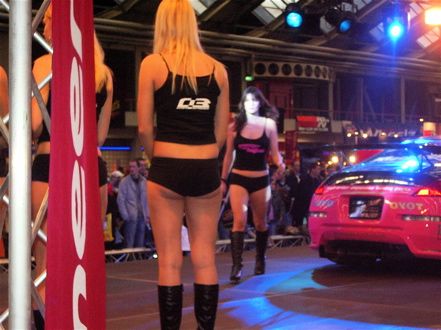 Alle clichés kloppen op de Explosive Car Tuning Show die afgelopen maand in de RAI plaatsvond: de harde house, de diepe decolletés, de stoere gastjes. Dit is de wereld van de omhoogscharende vleugeldeuren, van woofers die zo groot zijn dat ze de hele kofferbak vullen, van auto’s die nog geen handdikte boven het asfalt liggen en van fun-liners die je op je nummerbord kunt plakken met teksten als ‘Lach even naar me als je geen ondergoed draagt’ en ‘Ik ben tegen zinloos geflits.’
