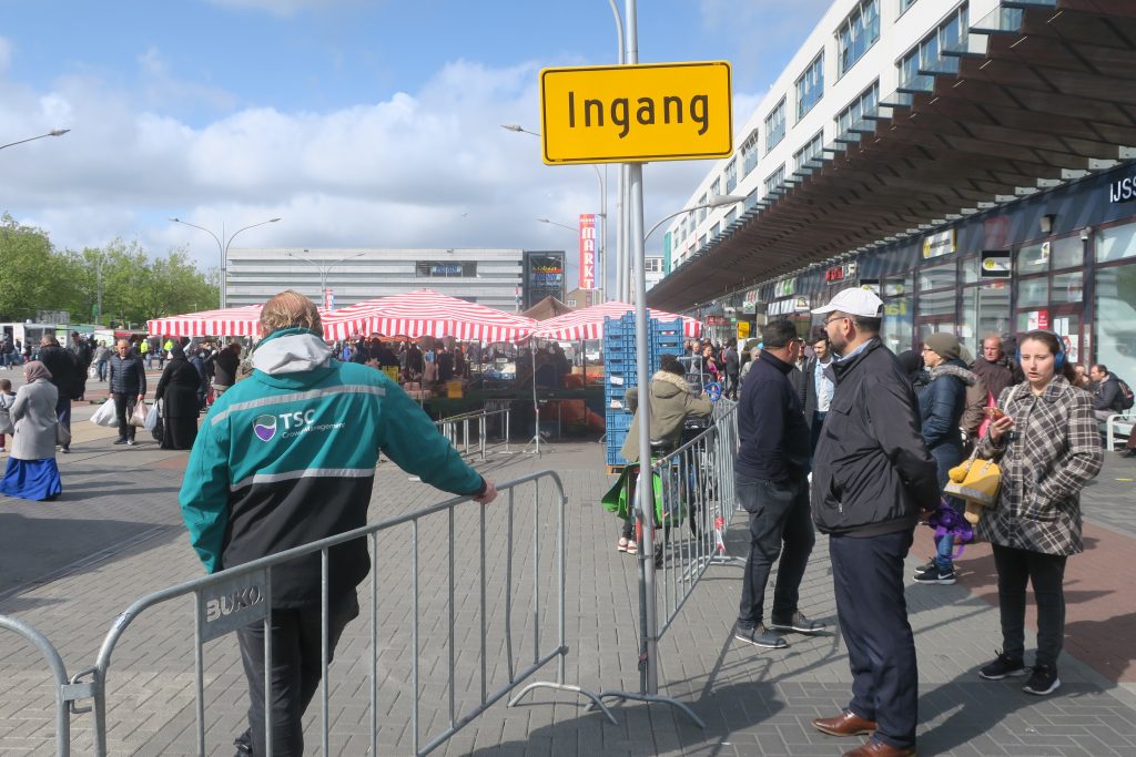 De markt draait goed, soms beter dan het Marktbureau lief is. Van der Vlugt: ‘Op het moment dat de zon begint te schijnen, knijpen we de billen tegen elkaar. Gelukkig hebben we pas één keer een markt hoeven te sluiten, die op Plein ’40-’45, maar dat verliep gedisciplineerd.’Sinds 4 april, de dag van de ontruiming, staan er dranghekken om het plein en staan de kramen aan de randen opgesteld, waardoor een middenterrein van ruim drieduizend vierkante meter leeg blijft. Bij de ingang staat een bewaker met een tellertje om bij te houden of er niet meer dan honderd mensen tegelijk binnen zijn. Vooral zaterdag aan het einde van de middag leidt dat tot een lange rij wachtenden, een vreemd contrast met de goeddeels lege vlakte.