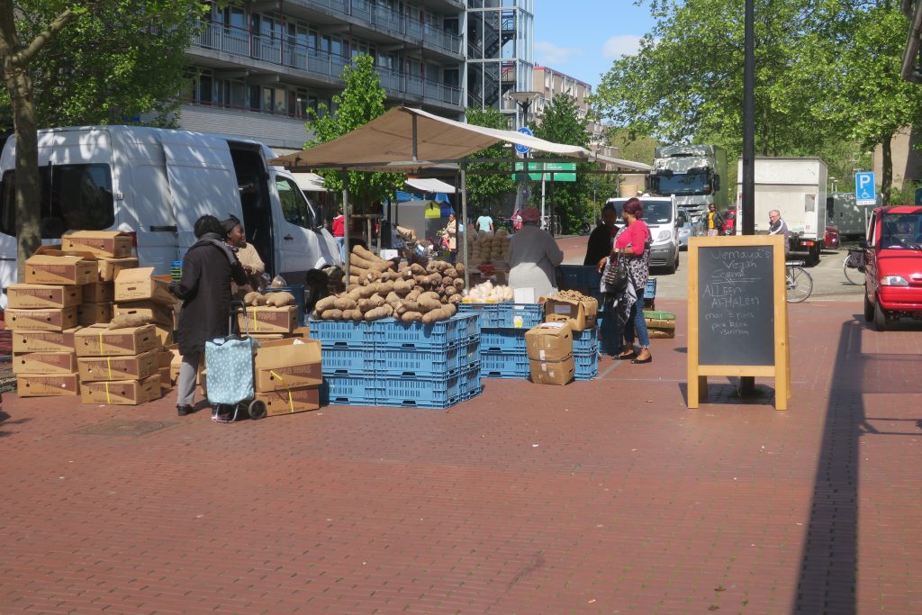 Asperges kosten hier geen 6,95 per pond zoals op de Noordermarkt, maar een schamele 1,75, voor watermeloen en trostomaten betaal je 98 cent per kilo, drie mango’s of een zak puntpaprika’s kosten één euro en als speciale ramadanactie krijg je elf ongebakken loempia’s voor een tientje.