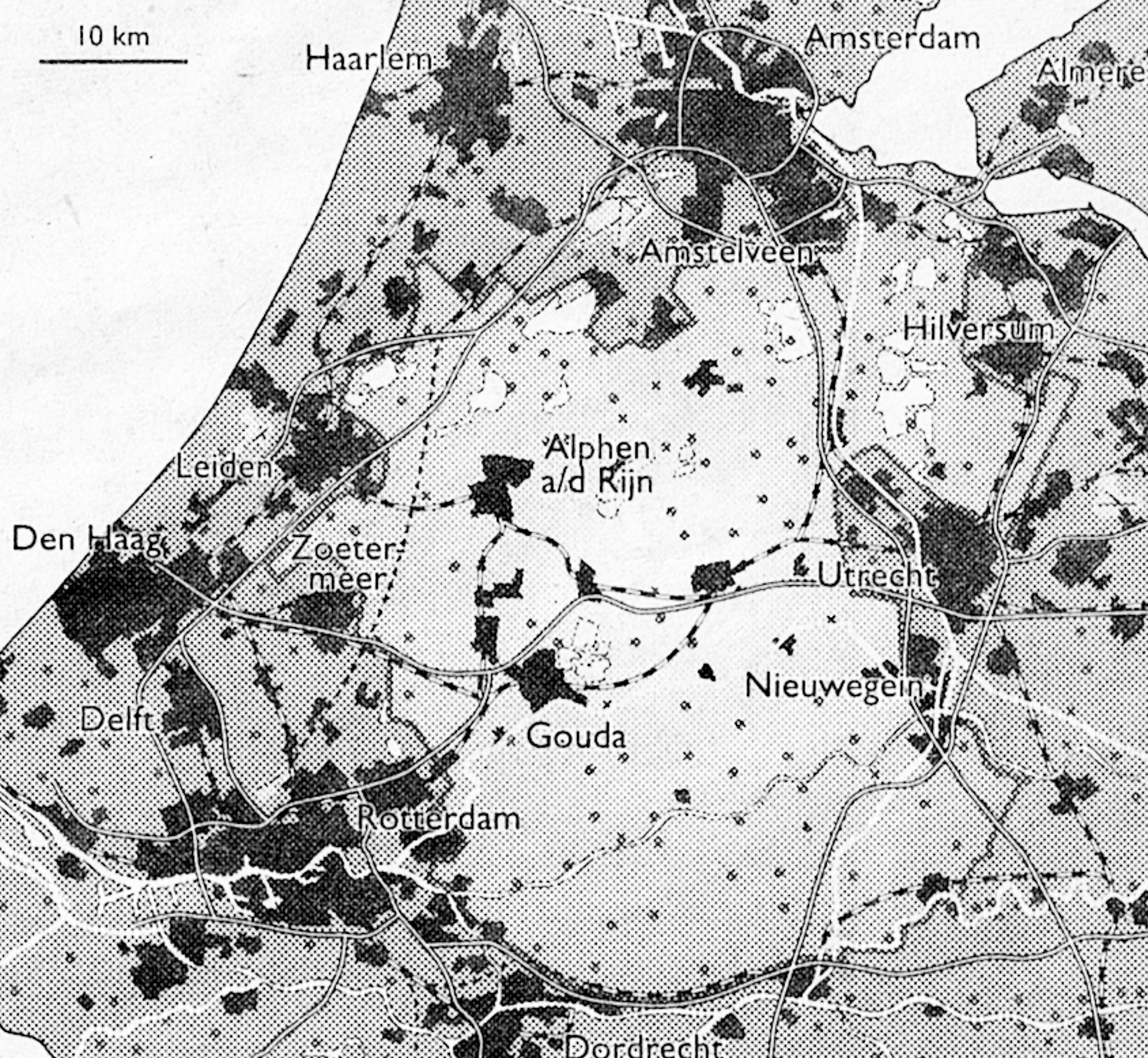 Nu al vestigen veel bedrijven zich langs de hoofdtransportassen naar Duitsland en België. Zij vormen de voorbode van uitgestrekte stedelijke patronen waardoor Nederland nog voller zal lijken en de wegen nog verder verstopt raken. Maar als het heilige model van het Groene Hart wordt losgelaten, komen ook andere oplossingen in beeld. Een blik op de kaart van de Randstad laat zien dat het complete Rhein-Ruhrgebied (11,5 miljoen inwoners) of Parijs (10,3 miljoen) erin past. Vooralsnog is de mythe van het Groene Hart zo sterk, dat niemand er rigoureus in durft te snijden. Sluipenderwijs verstenen ja, maar grote ingrepen zijn onbespreekbaar.