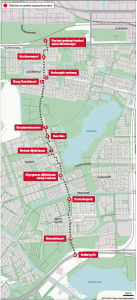 Links van het pad zie je moderne bakstenen gebouwen, rechts gepleisterde portiekwoningen uit de jaren vijftig – ze vormen een groot contrast. Aha, dus dat is waar je op moet letten om het tracé terug te vinden: een lint nieuwbouw dat de oorspronkelijke wederopbouwwijken van Geuzenveld en Osdorp doorsnijdt.