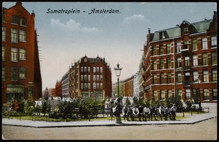De Indische Buurt hield hier indertijd nog abrupt op. Sumatrastraat 72, op de hoek van het plein, was het laatste huis, daarna begonnen de sloten en weilanden. Tot in 1923 het startsein werd gegeven voor de tweede fase van de Indische buurt: het polderlandschap verdween onder een laag zand en in no time verrezen er achtduizend woningen in de stijl van de Amsterdamse School. Ook de Sumatrastraat is toen doorgetrokken, ze werd ruim vier keer zo lang. De nieuwe Indische Buurt was geboren, het was in die tijd de ‘grootste voorstad van het land’.