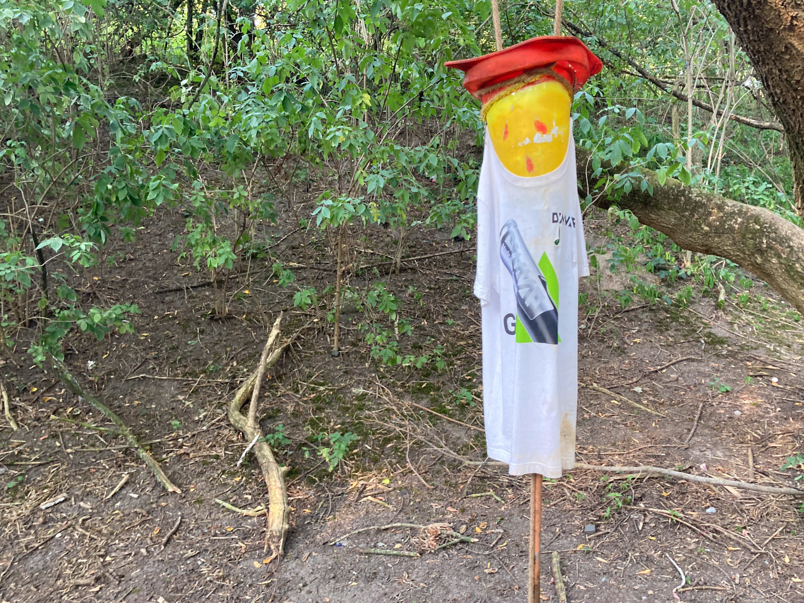 En dan stuit je aan de rechterkant, tegen de hoge dijk van de S100, op een klein bosje. Houd zoveel mogelijk rechts aan en je komt na een paar honderd meter op een stille, open plek. De grond is aangeveegd, aan een boom hangt een kunstwerk dat gemaakt is van een beschilderde piloon en een wit T-shirt – het heeft wat weg van de Schreeuw van Mönch, maar toch voelt het hier vreemd vredig aan.