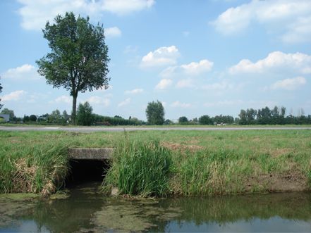 De meeste duikers vind ik gelukkig wel en ze blijken over een merkwaardige schoonheid te beschikken. Meestal zijn het eenvoudige betonnen bakken, slechts een klein stukje steekt boven het wateroppervlak uit. Die rand is vaak korstig en verweerd, waardoor ze veel ouder ogen dan ze zijn. Het lijkt alsof ze er altijd hebben gelegen, als restanten van een vervlogen beschaving. Kant-en-klare onderwerpen voor landschapschilders, want deze minimale bouwwerkjes lijken met hun entourage van water, riet en weilanden buiten de tijd te liggen. Hun tijdloosheid staat in scherp contrast met de wijdere omgeving, waar kassen, bedrijfshallen, grootschalige landbouw en woonwijken oprukken.Af en toe vind ik een duiker die niet op de lijst staat. Tegenover het reclamebord van partycentrum Suylighem blijkt nummer 322037 een broertje te hebben dat de parallelweg voor zijn rekening neemt (> 322037a). Waarschijnlijk is de kleine duiker in beheer bij de boer, want het oude metselwerk is grof hersteld met beton. Een plaatje.
