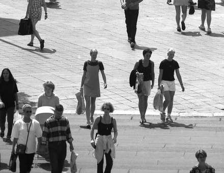Het geslacht hebben de onderzoekers niet geturfd, maar een blik volstaat om te zien dat die mensen vooral vrouwen zijn. Door de week is dat nog extremer, dan vormt de Demer een bijna exclusief vrouwelijk domein: vrouwen alleen, met zijn tweeën, in groepjes vriendinnen, met hun moeder, schoonmoeder, oudtante, kinderen. Met de fiets in de hand, in een rolstoel, met grote boodschappentassen, met kekke tasjes. En als ze een man bij zich hebben, dan lijkt die al snel een bejaarde, ook als hij pas zeventien jaar oud is en zijn haar in blonde stekeltjes overeind staat. Onder het winkelpersoneel is het percentage vrouwen nog hoger dan op straat: een keur aan verveelde, naïeve, hautaine, dromerige, brutale, hoopvolle en wereldwijze winkelmeisje wacht op de klandizie.