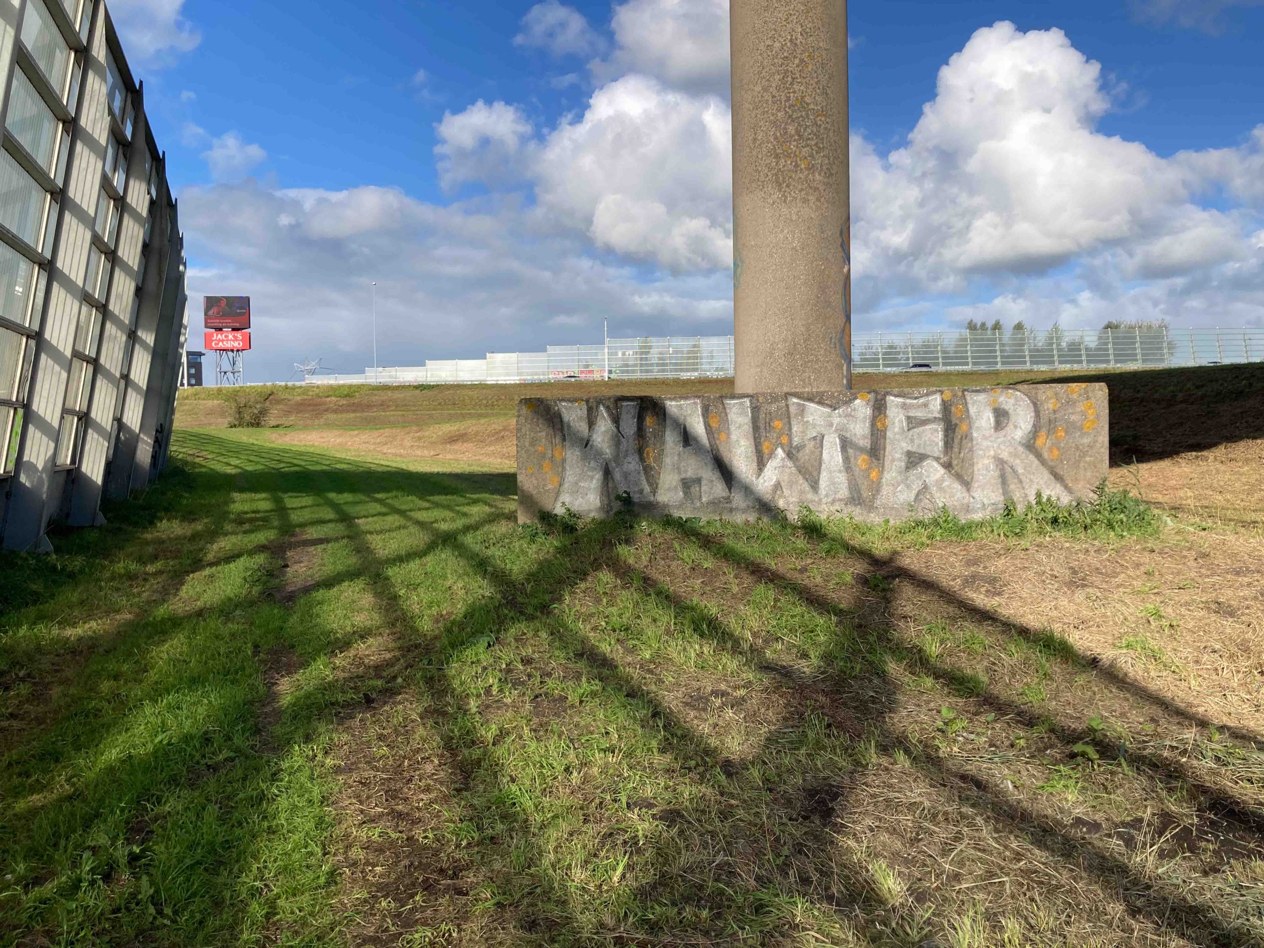Letterlijk ín de knoopVolg het fietspad langs de A8, neem het tunneltje onder de invoegstrook en dan onder de snelweg zelf – let op de dikke plakkaten van oude posters op de pilaren – en dan weer rechts, langs de Verlengde Stellingweg.