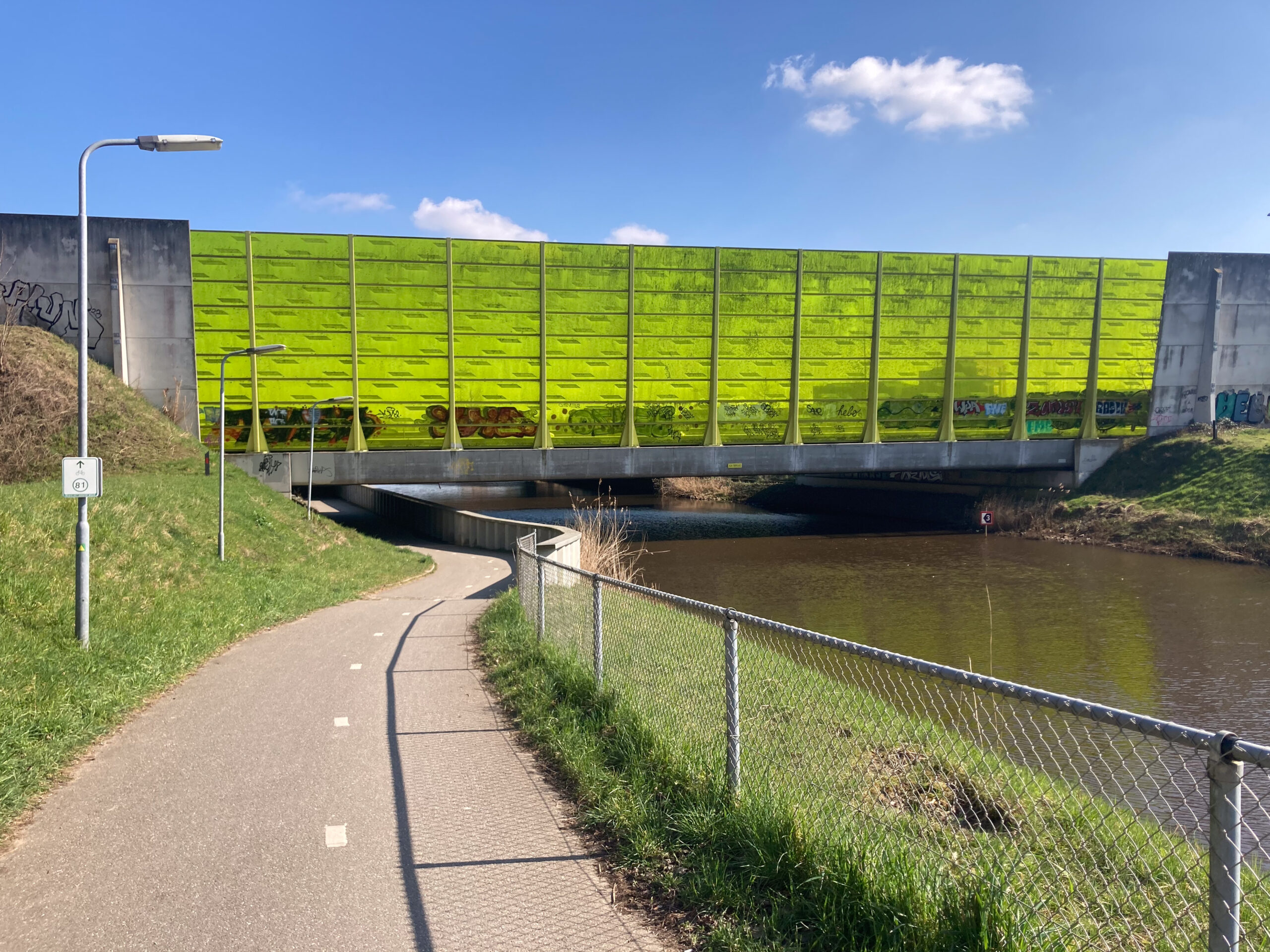 En wat te denken van de gedenksteen voor Herman Otto, de te vroeg overleden architect van de geluidsschermen langs de Nederlandse snelwegen. Hij ontwierp ook de fraaie schermen van dit knooppunt. En die kinderlijke gele kleur, die doet denken aan een proleterige zonnebril? Daar heeft Otto niets te maken, dat heeft ene B. van B. bedacht, de Nederlandse architect die naar eigen zeggen zorgde voor ‘a more consistent visual aspect to this stretch of motorway’. Met historisch besef heeft dat in ieder geval niet veel te maken, met je moerstaal evenmin.