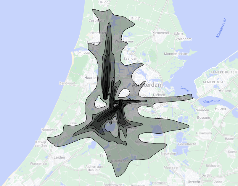 Is het een abstract schilderij van een olieramp? De MRI-scan van een kankergezwel? De afdruk van een met pek ingesmeerde hand? Onlangs besloten we de officiële geluidscontouren van het RIVM te downloaden en op Google Maps te zetten. Daar kleurden de contouren grijs en zwart: hoe groter de herrie, hoe donkerder de kleur.