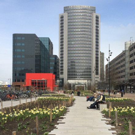 Het loop tegen het einde van de dag, de kantoren gaan uit. Op het kunstgrasveldje aan de achterzijde van het station, op de plek die in het bestemmingsplan wordt aangeduid als kavel L-midden, voetballen de helpdeskmedewerkers van provider Xs4all. In de wintermaanden ligt hun vrijdagse wedstrijdje stil, maar de weersverwachting was goed, dus hebben ze hun trainingspakken meegenomen.
