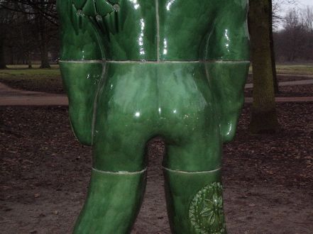 En zo gaat BGK, heel sadistisch, niet in op de provocatie van Rembo en wens ik het beeld een ongeschonden toekomst toe. En tegen alle vernielzuchtige wandelaars zou ik willen zeggen: Laat je niet provoceren en houd je handen thuis. En mocht het je allemaal teveel worden: er staat in dit park nog genoeg kunst, meer dan genoeg. Neem bijvoorbeeld die hondjes verderop op het viaduct