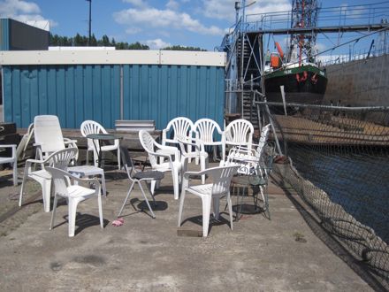 Honderd meter verder, op nummer 419, ligt een café zonder naam. Aan de voorkant kijkt het uit op twee huisjes en de hoge loods van Scheepswerf Vooruit, aan de achterkant op de begraafplaats. Bier drink je hier uit de fles, de broodjes bal zijn niet zelf gemaakt – ‘Ben je besodemieterd, weet je wel hoeveel werk dat is?’ zegt de barman.